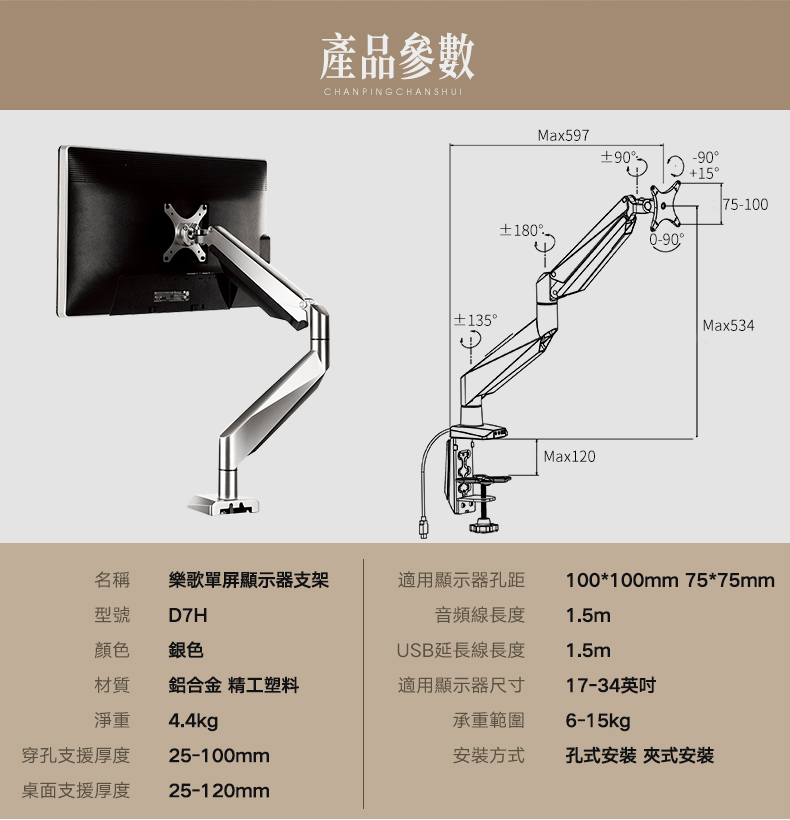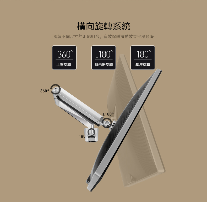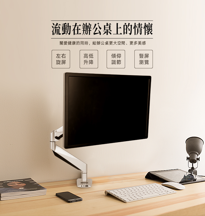 ◆仰角調節90度 俯角調節15度 ◆仿生懸臂 自由伸縮省空間 ◆內置氣彈簧懸臂系統 自由懸停